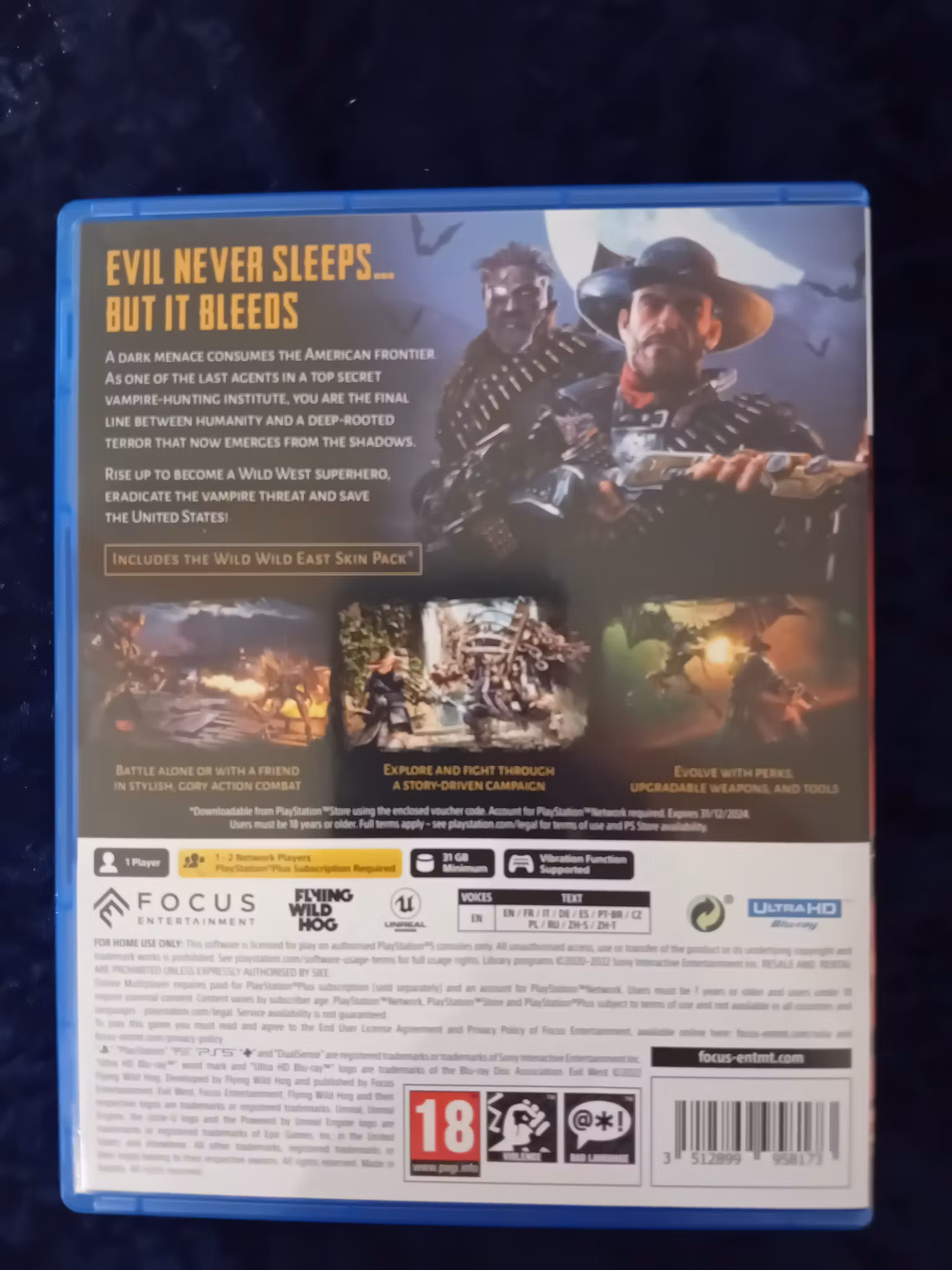Evil West Ă€r ett actionâhackâandâslashâĂ€ventyr dĂ€r du spelar som en hĂ„rdhudad vampyrjĂ€gare i ett alternativt, mörkt VildaâŻVĂ€stern. Utrusta dig med revolvrar, gevĂ€r och en blixtdriven stridshandske och ta dig an groteska monstrositeter som hotar USA i en explosiv berĂ€ttelsedriven kampanj â ensam eller i coâop med en vĂ€n pĂ„ PS5!