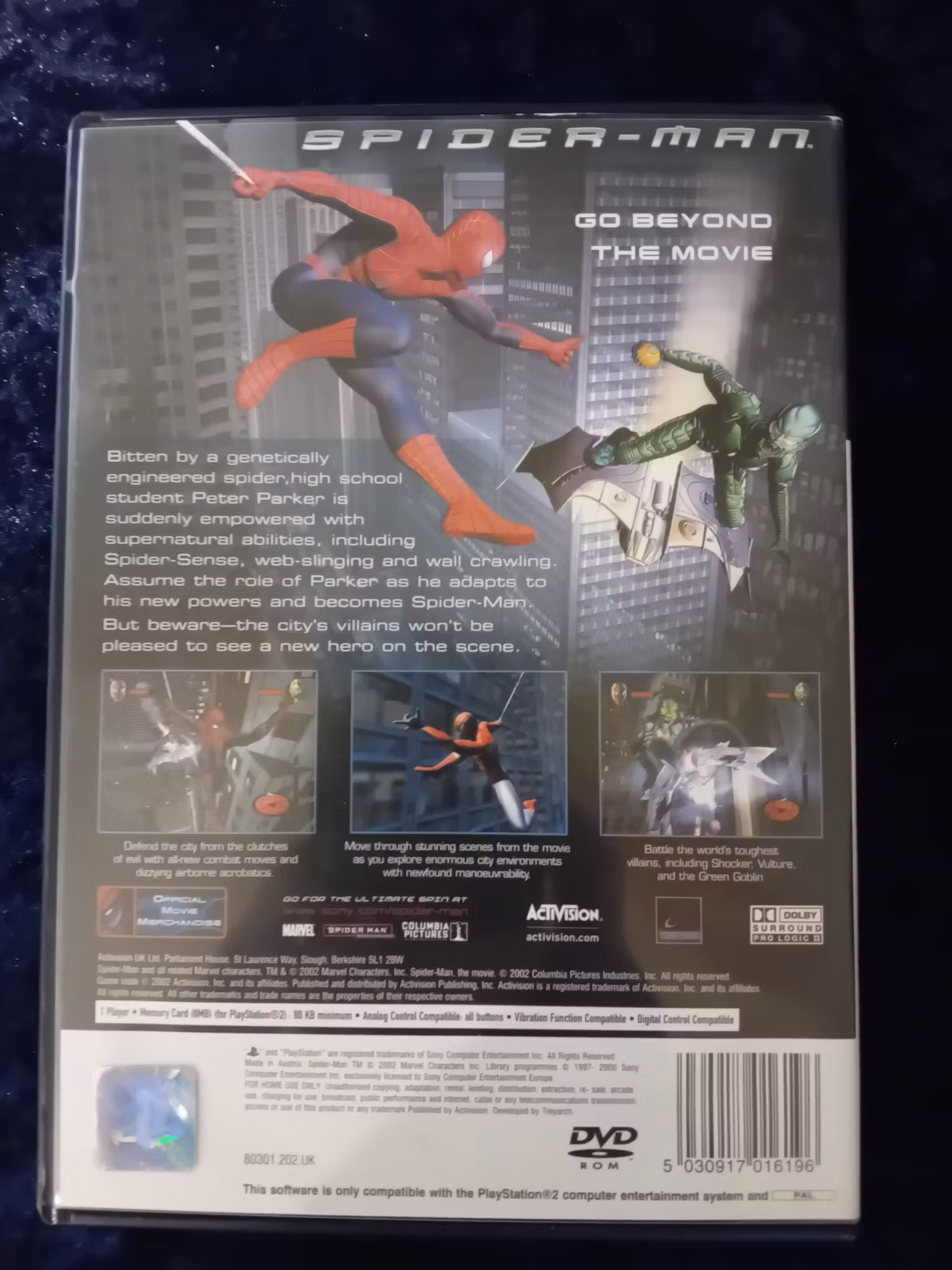 Spider-Man låter dig spela som Peter Parker, använda dina superkrafter och webbsvinga mellan skyskrapor för att stoppa kriminalitet och rädda staden. Spelet kombinerar plattformshoppning, strid och spännande uppdrag på PS2.
